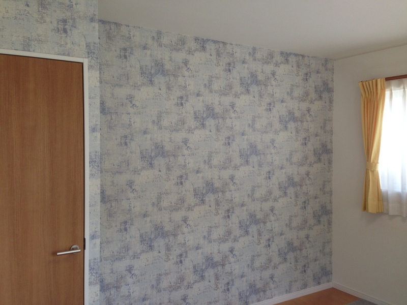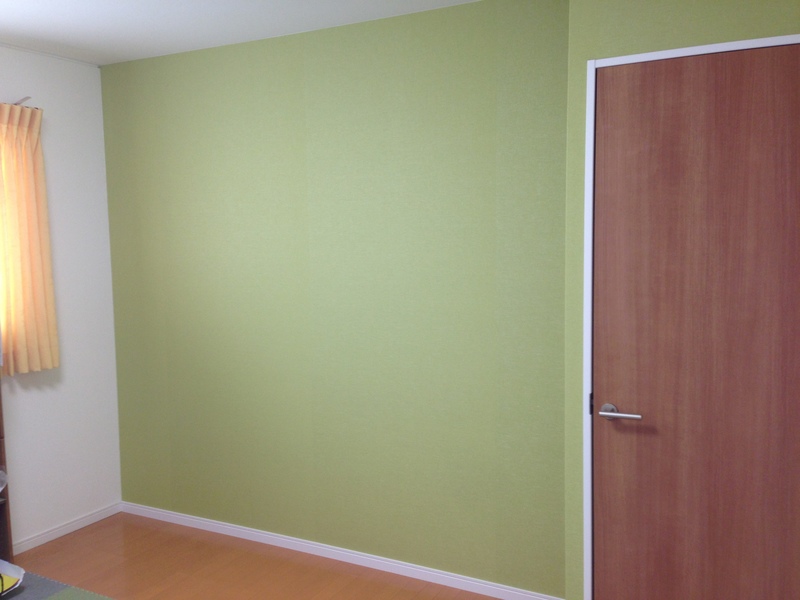 グリーンの壁、ブルーの柄の壁。